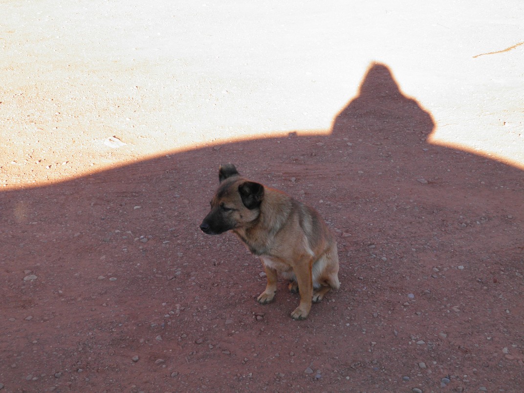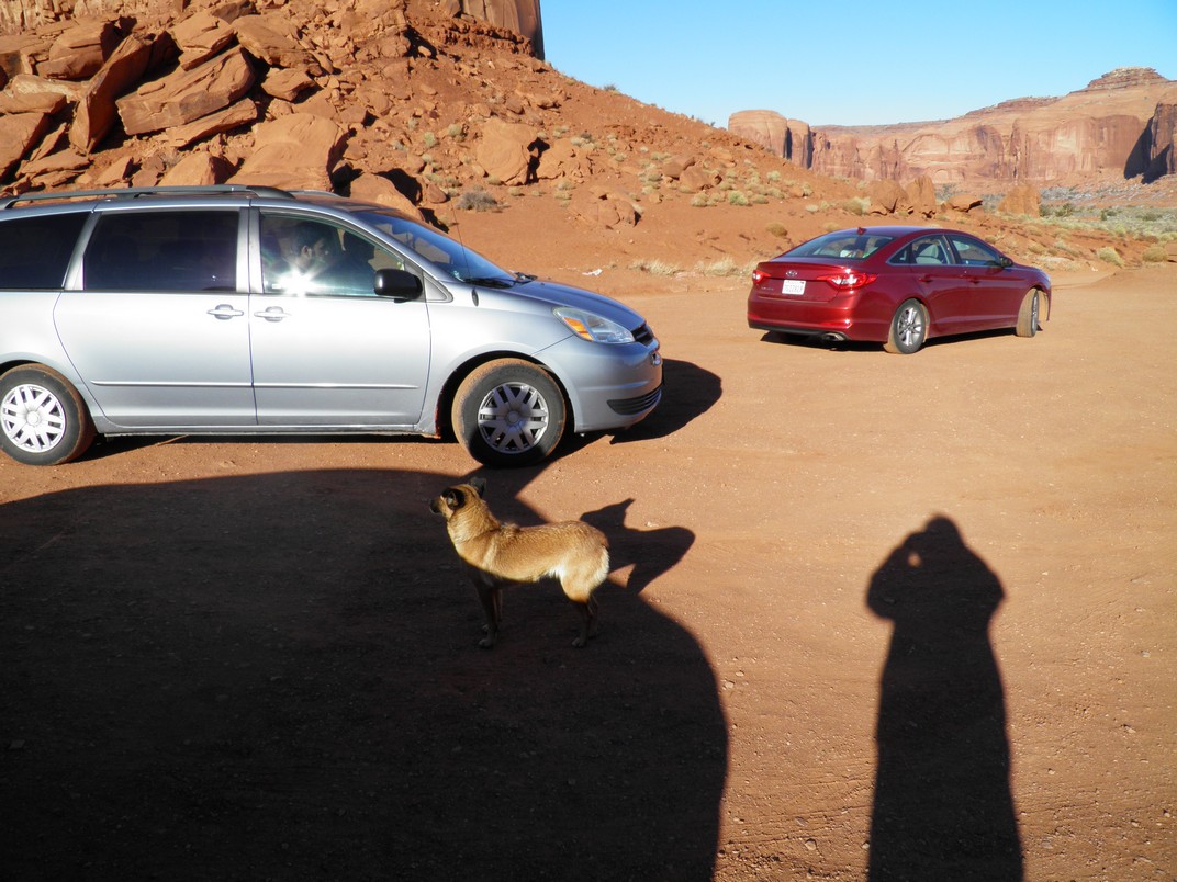 Soon after we arrived at Thunderbird Mesa, a little doggy appeared out of nowhere looking for food. We had seen a number of strays in the parking lot travelling in packs and a few along the drive. This guy was on his own so Kim gave him some of her lunch. He was happy to eat it and was sad to see her go!