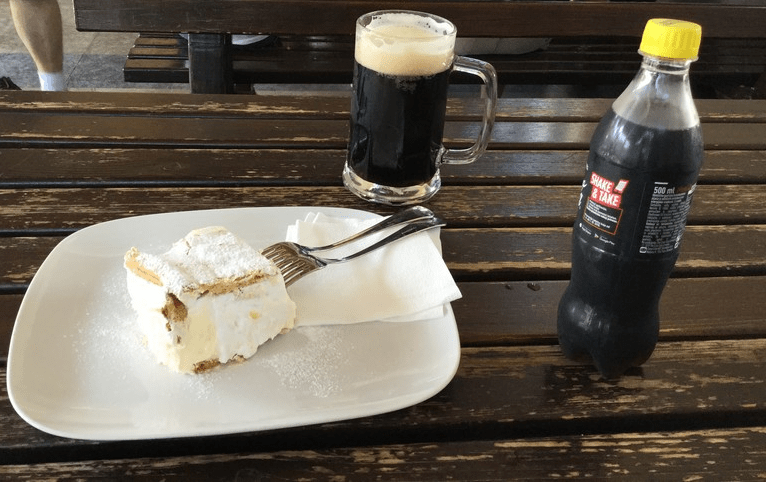 Fortunately we did a good pace and returned with time to spare, so while waiting for the bus we had something in the park restaurant. The beer was made on the premises and was a refreshing end to the journey. Kim enjoyed the cream cake, a favourite of hers since we first tried it in Lake Bled.