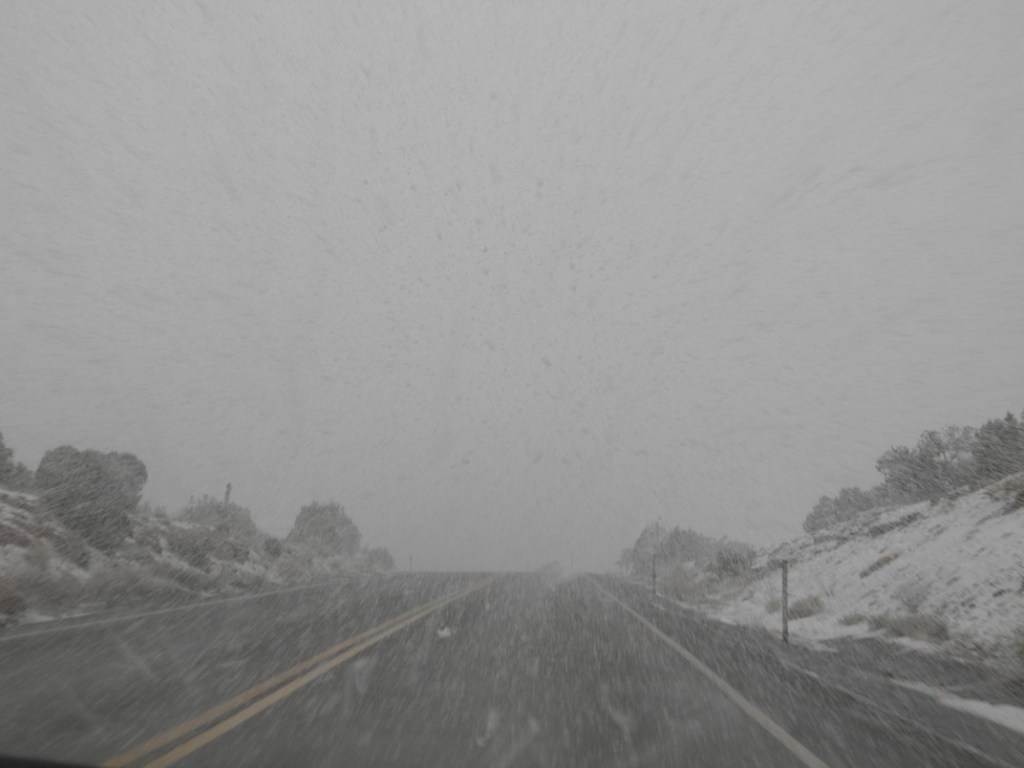 We were nearing the end of the viewpoints when the weather started getting worse. Clouds had been coming in since the early afternoon, but by late afternoon it was completely clouded over and darkening. As we drove towards a final viewpoint the snow started falling.