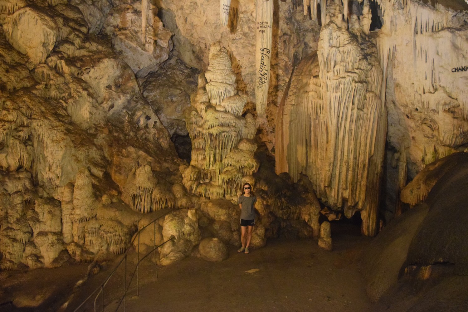 The stalactite above Kim’s head looked like a giant monogrammed baseball bat
