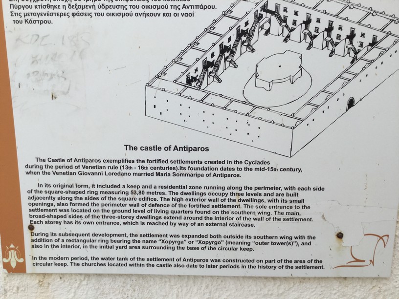 Dating from the 15th century, the Castle (Kastro) of Antiparos was a small Venetian fort. The original shape and walls of the fort are still in the centre of town, and the rest of the town has organically grown around it.
