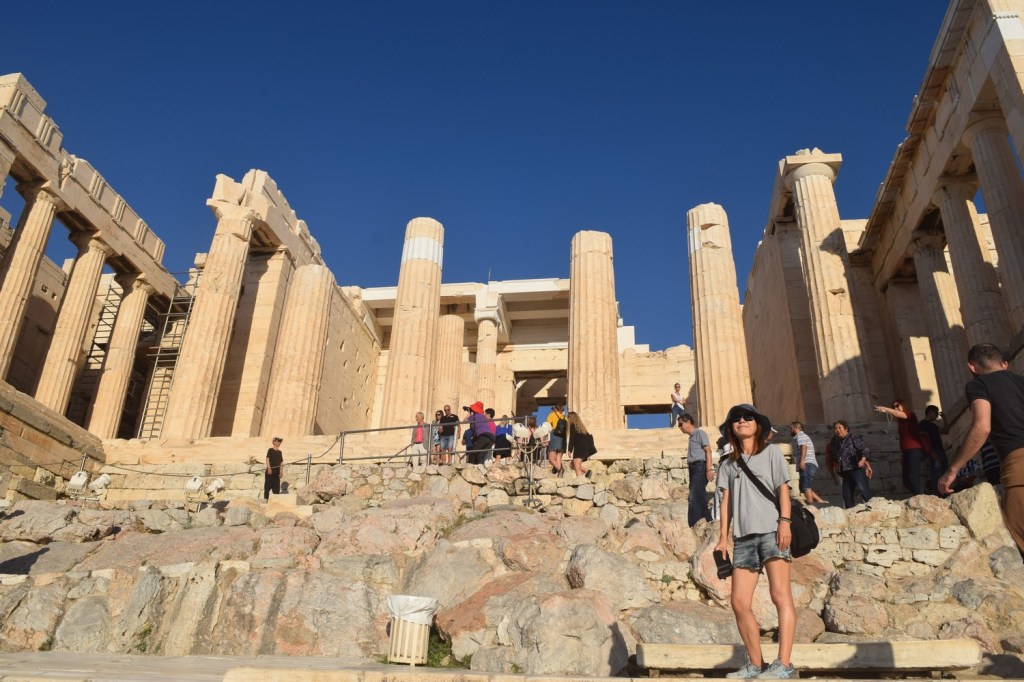 To get to the top you pass through the Propylaea, a public works project initiated by Pericles after the end of the Persian Wars. It was built from 437-432 BC when work stopped and it remained unfinished. Those allowed entry thorough here to the Acropolis could claim the protection of the gods.