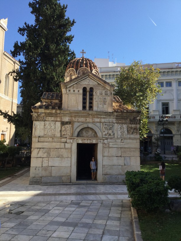 Closer to the action was the Church of Panagia Kapnikarea. Almost 1000 years old, it followed the theme of building churches on top of temples. It was built on the site of an ancient temple to Athena or Demeter and is now surrounded by bakeries and shops. If you wish to see inside, make sure you are modestly dressed or they won’t let you enter. We couldn’t go in because Kim was wearing shorts.