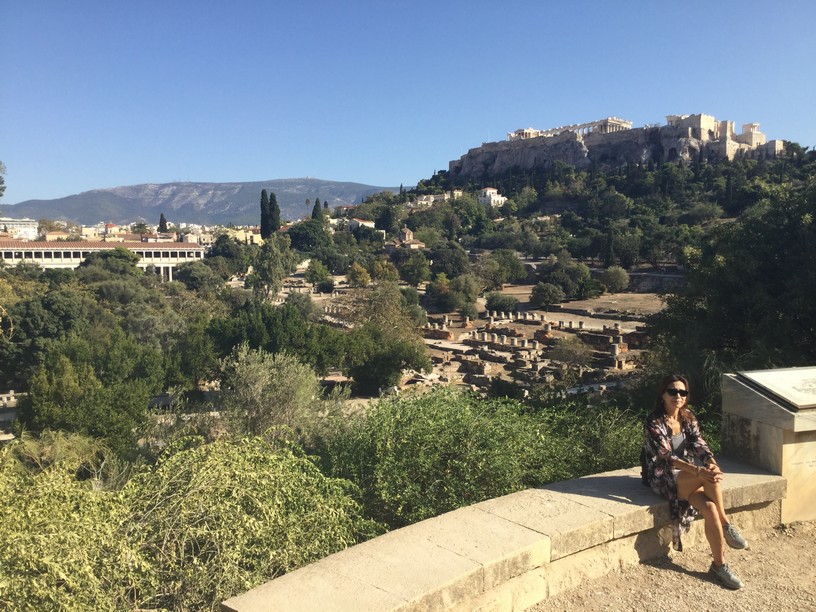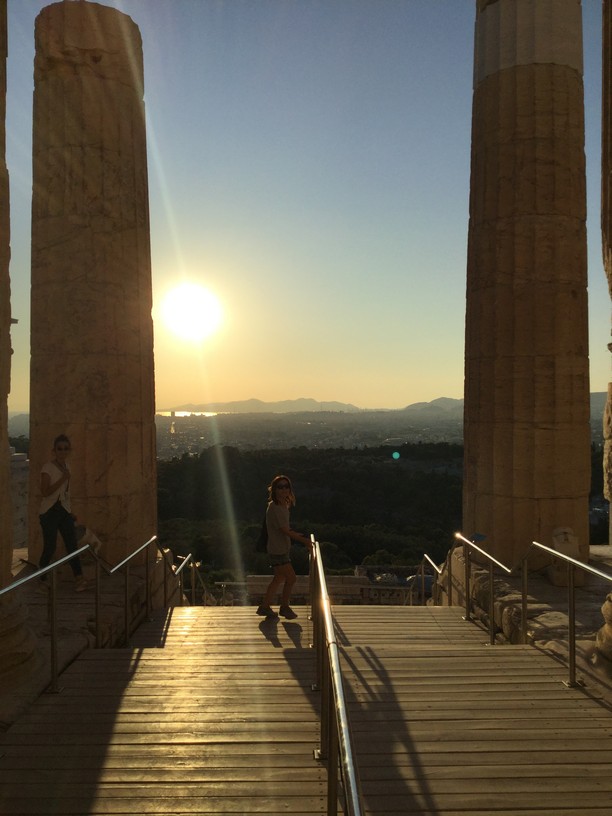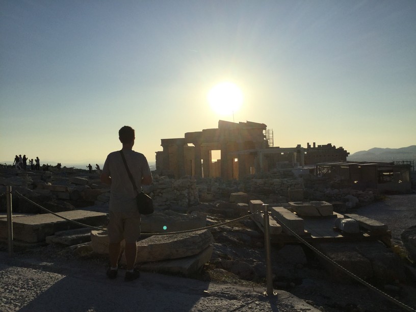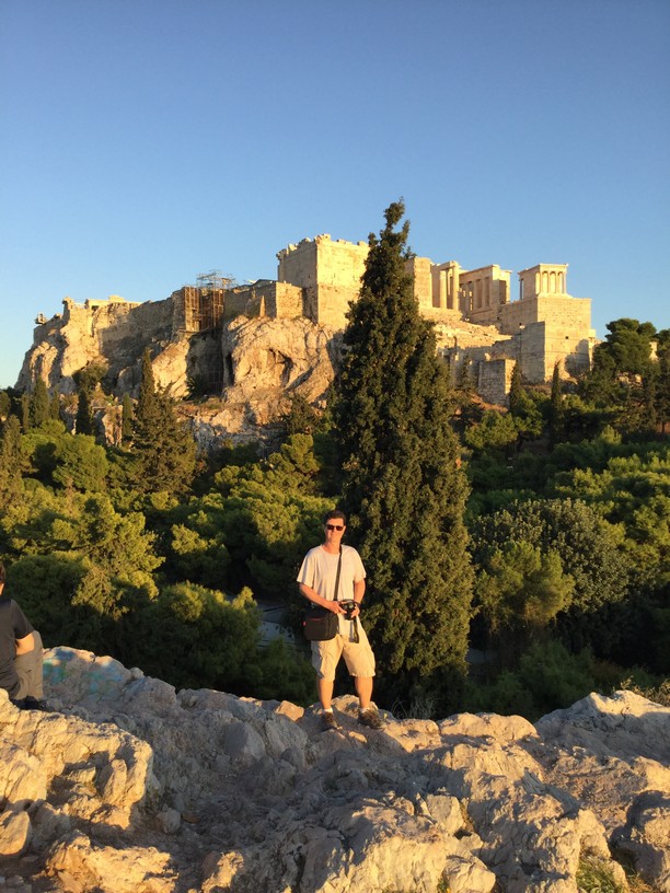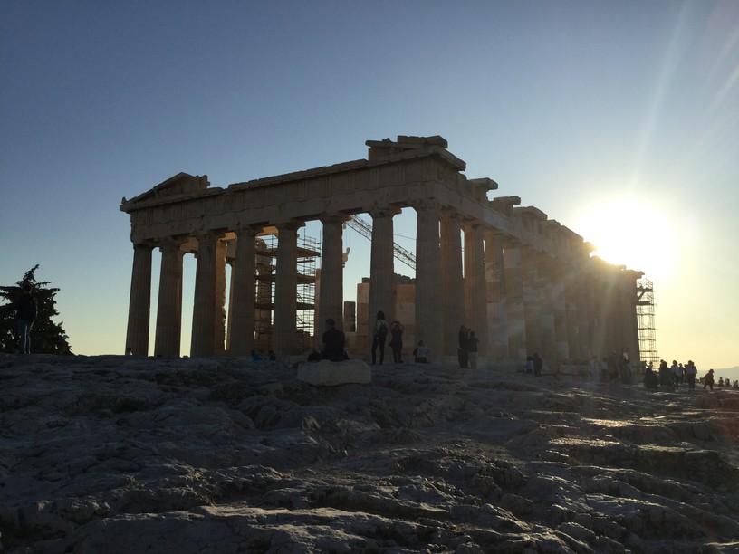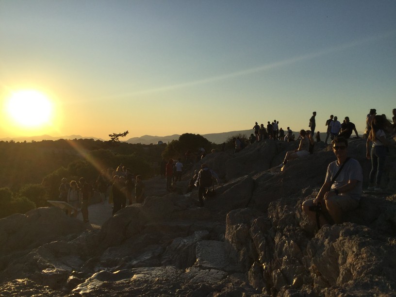 With the Acropolis now closed we made our way over to the large rock we had noticed after climbing up the Acropolis. It turns out this hill had a lot of significance. It was the Aroepagus (Hill of Ares), a place that served as a court in classical times. Trials involving murder, arson and olive trees(!) were held there, and even the god Ares was reputed to have been put on trial there for murdering Poseidon’s son. For us, it was the perfect spot to watch the sunset with the Acropolis as the backdrop.