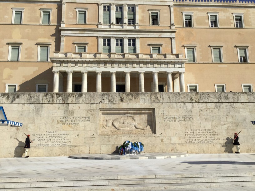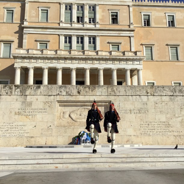 Another time we saw the Changing of the Guard at Syntagma Square. The soldiers are Evzones, members of the Presidential Guard. They stand perfectly still in front of the Tomb of the Unknown Soldier in all conditions. Then, on the hour they do a switch of positions. This allows them some circulation after standing still for so long. Behind the Tomb of the Unknown Soldier is the Greek Parliament.
