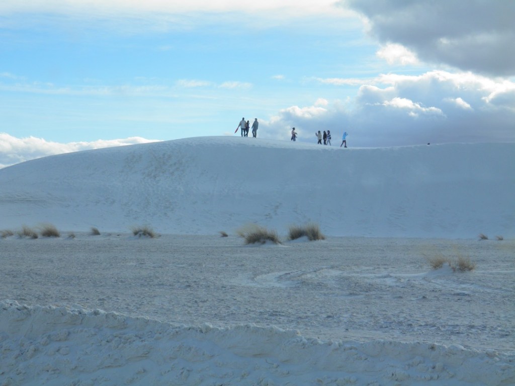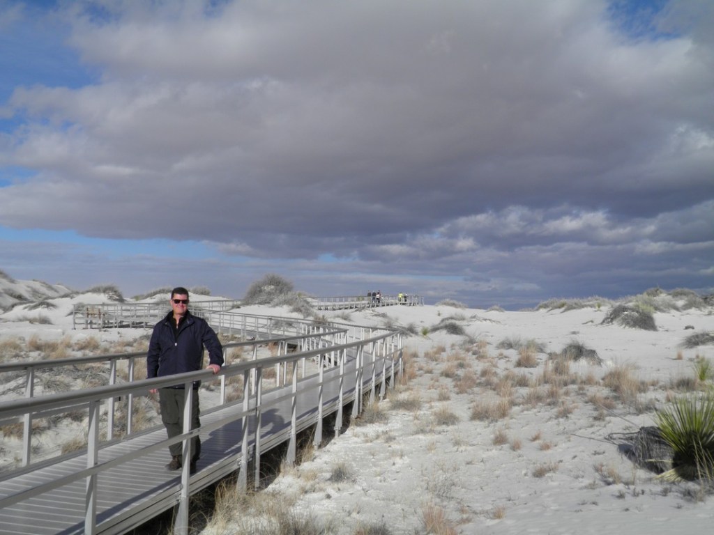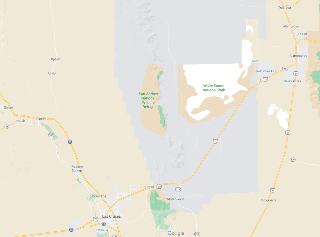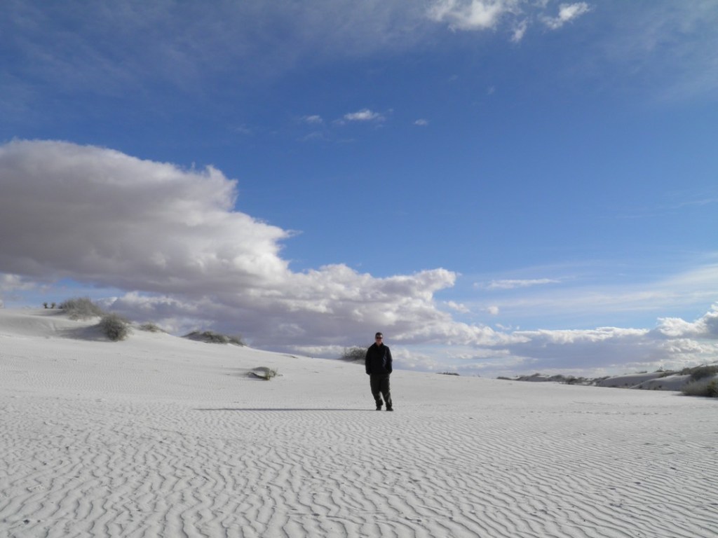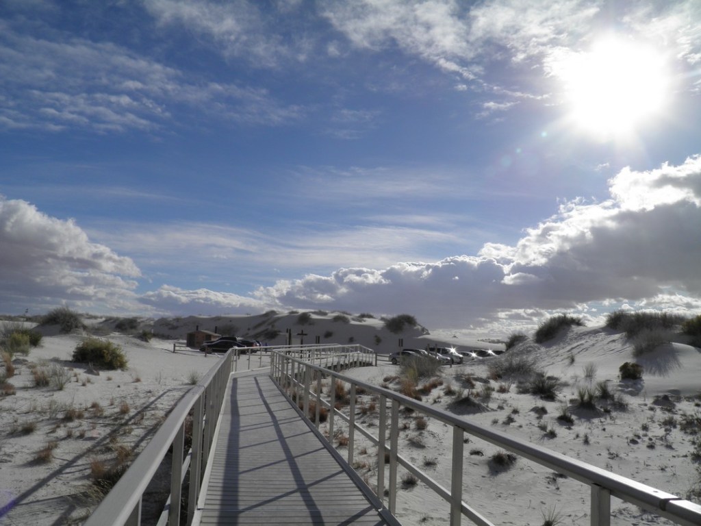 When driving east on Interstate-10 across the southern part of New Mexico, you will generally see flat lands with low hills and plateaus in the distance. But eventually the landscape will change, and you will notice bands of white appearing in the distance. Eventually these white patches of sand change into dunes, as seemingly endless gypsum fields come into view. On a sunny day the flecks of gypsum reflect with a particular brilliance, giving the desert a dramatic appearance.