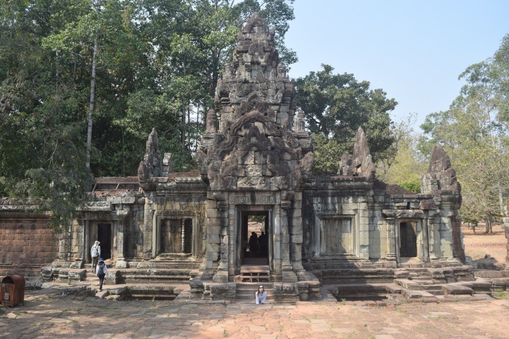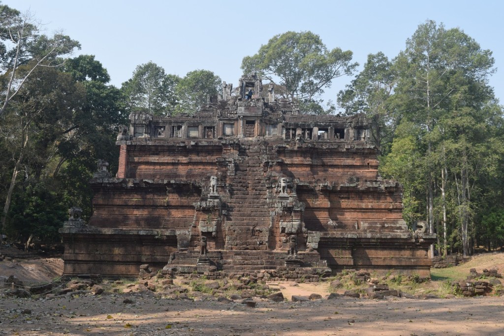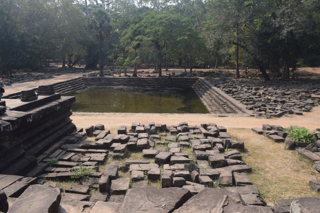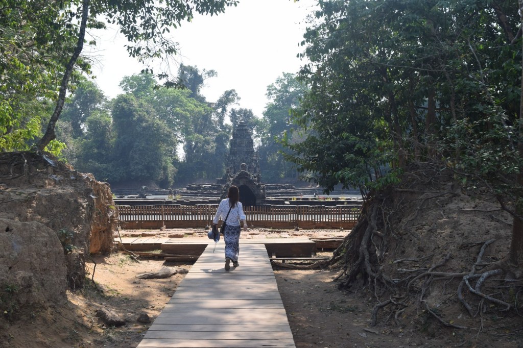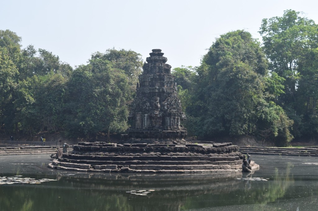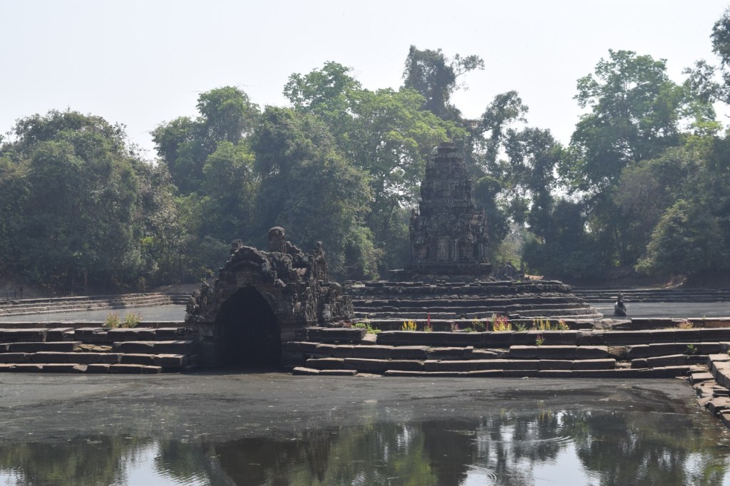 A short distance away was Neak Pean. This is a tiny temple built as an artificial island. It was constructed during the reign of King Jayavarman VII, and was said to have been created for medicinal purposes. It was believed the pools of water around the temple would balance anyone who bathed in them. Needless to say, the pools didn’t look so inviting now, but it made for a dramatic appearance compared with many of the other temples located squarely in the jungle.