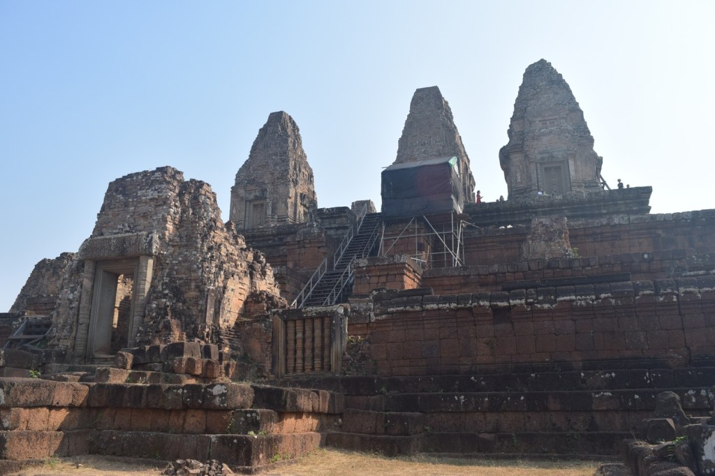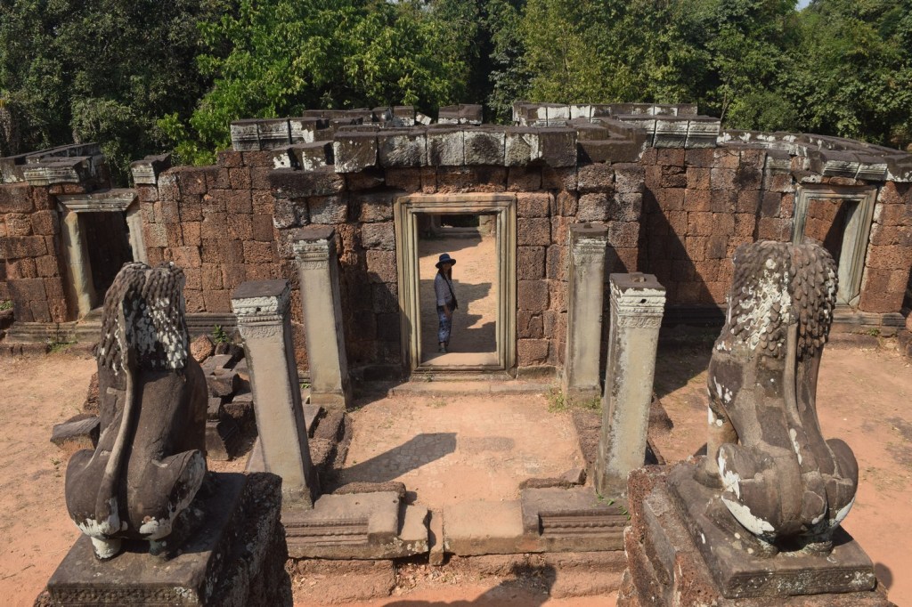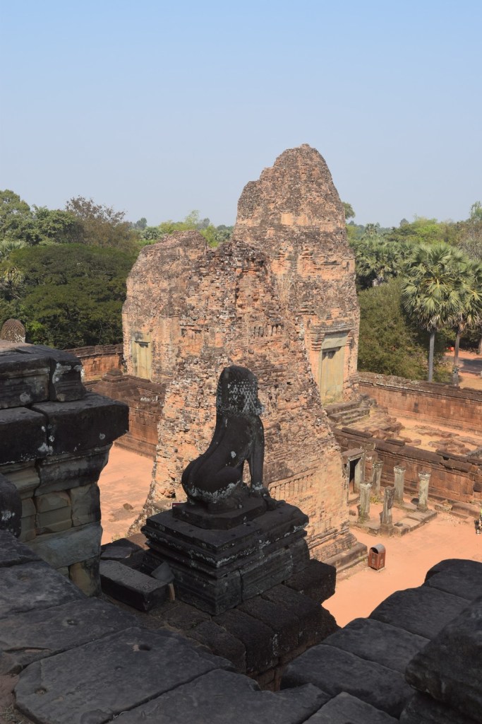 The impressive Pre Rup temple was our last stop for the day. Built in the mid-900s, it was dedicated by King Rajendravarman II. The temple’s name means “turn the body”. It refers to the belief among Cambodians that funerals were conducted at the temple, with the ashes of the body being ritually rotated in different directions as the service progressed. A number of deities that looked like a combination of humans and beasts stood guard around the temple. Built in a square pattern, it contained long galleries along each side and towers in the centre. We spent a bit more time at Pre Rup as it was a larger complex.