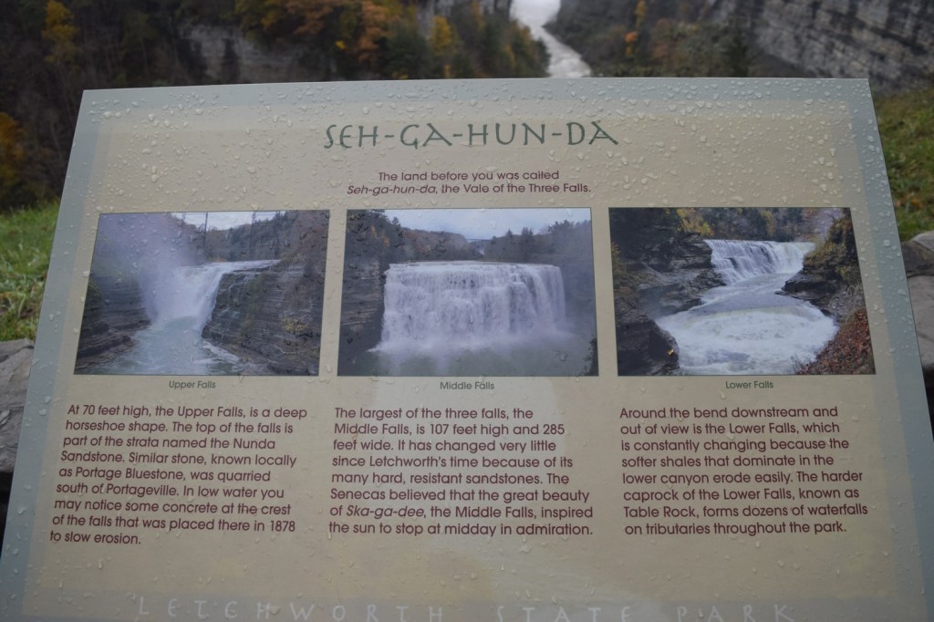 The territory of the park was long part of the homeland of the Seneca people, who were largely forced out after the Revolutionary War as they had been allies of the British. The Seneca called the land around this canyon Seh-ga-hun-da, the “Vale of the three falls.” The Seneca named the middle falls Ska-ga-dee, and believed it to be so wondrous it made the sun stop at midday