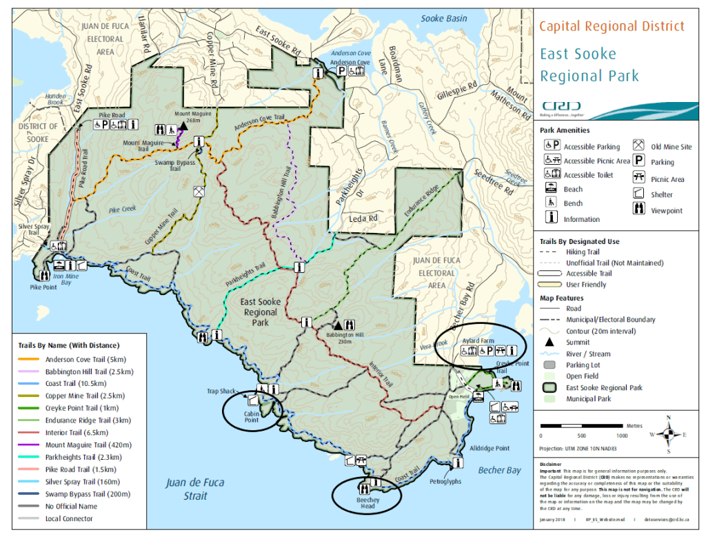 Though a one-way trip requires more planning, it is possible to get much of the experience (and challenge) in an abbreviated round trip. Taking the trail from Aylard Farm to Cabin Point is a great way to experience ocean views along the Juan de Fuca Strait without worrying about the return trip. At 5.5 km (3.4 miles), it’s about half the distance of the full coastal walk and works as a loop trail with connections back through the forest. We spent almost 4 hours walking and scrambling up and down the rocky coastline before enjoying a much faster and less strenuous forest walk back to the car.