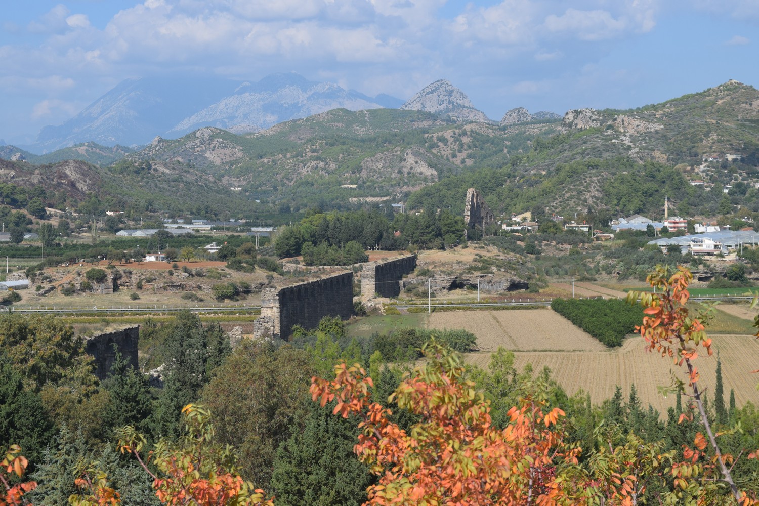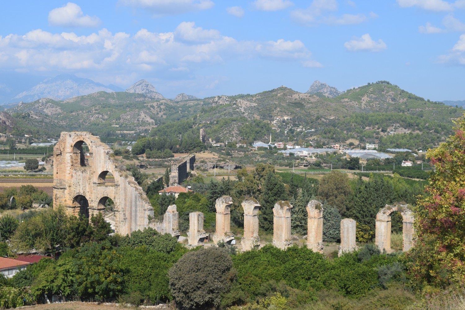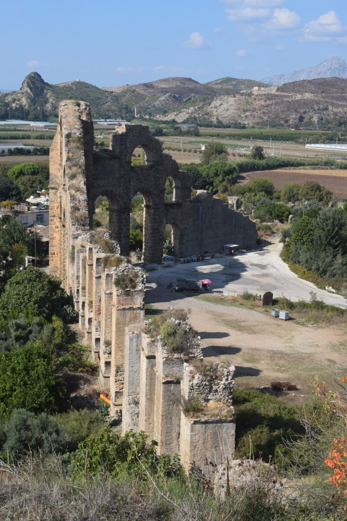 Before we went into the ruins of Aspendos, we drove around the area and found the ruins of the aqueduct first. Aside from its famous theatre, this is one of the most impressive features there. From above and around the ruins, we could see whole sections of the 15 kilometre (9.3 mi) Roman aqueduct still remaining,