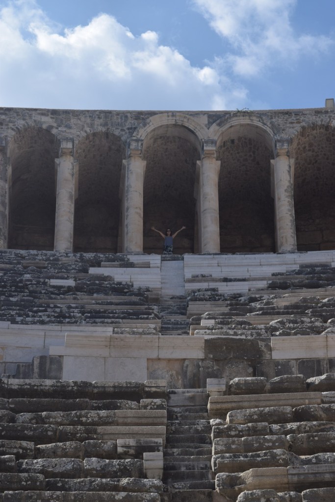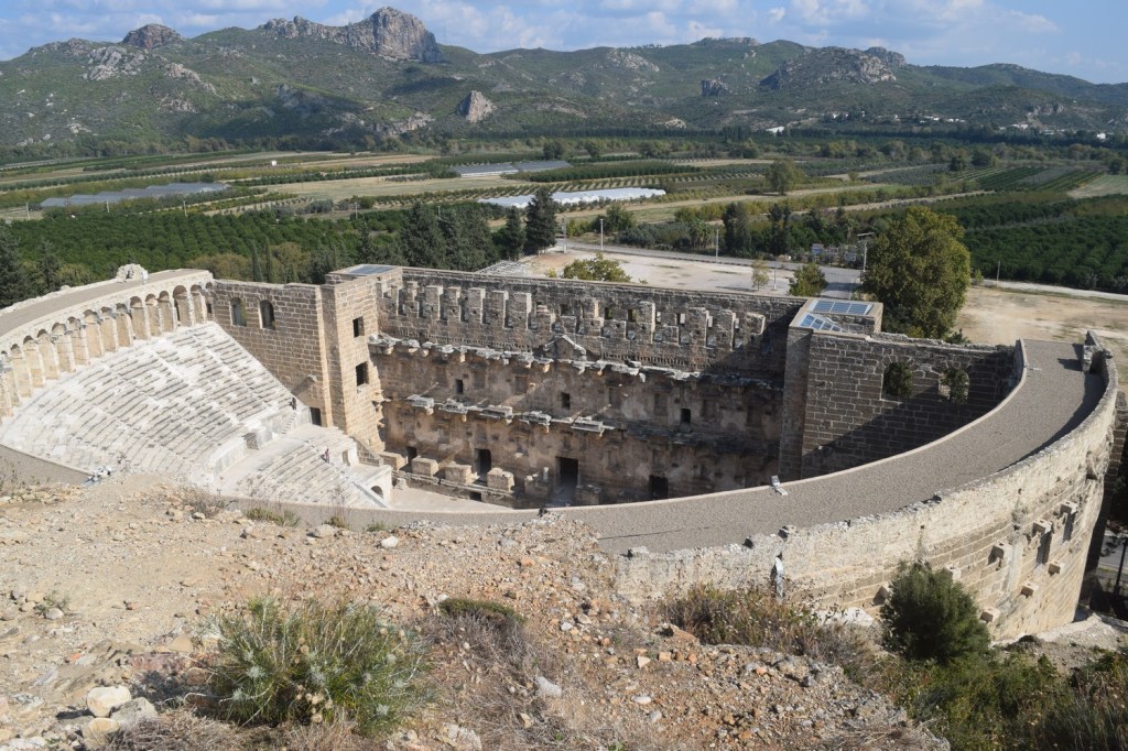 From the Wikipedia entry: “With a diameter of 96 metres (315 ft), the theatre provided seating for 12,000. It was built in 155 by the Greek architect Zenon, a native of the city. It was periodically repaired by the Seljuqs, who used it as a caravanserai, and in the 13th century the stage building was converted into a palace by the Seljuqs of Rum.”