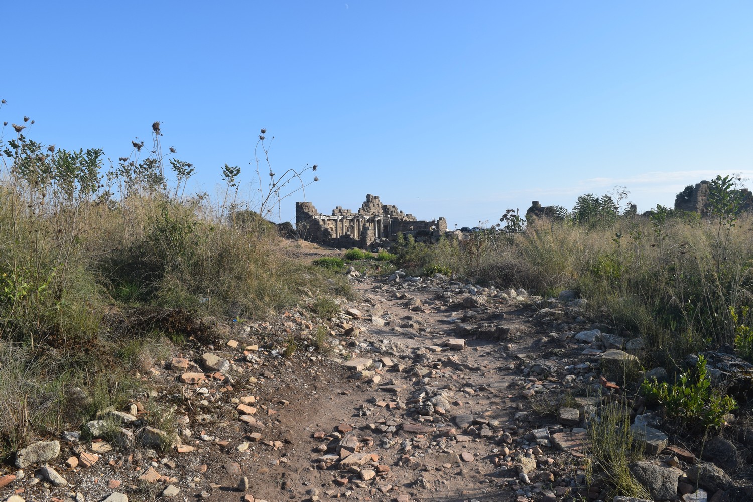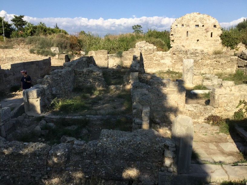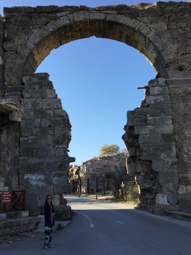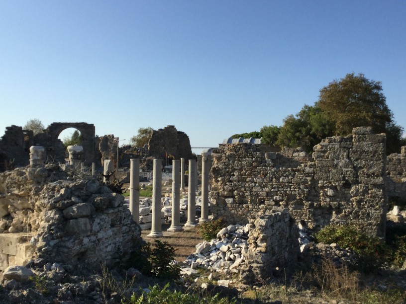 There is a whole resort area just a little up the coast from Side, but it was much quieter in October and we hardly noticed it on the drive down. As we drove into the older part of town it became apparent that the main walking trail for tourists was located on either side of the only way in. Eventually we passed various ruins until we found private parking lots all around the main entrance. The town is compact, with ruins spread all around and a small touristy city centre close to the sea. Most of the inhabitants live further inland away from the ruins.
