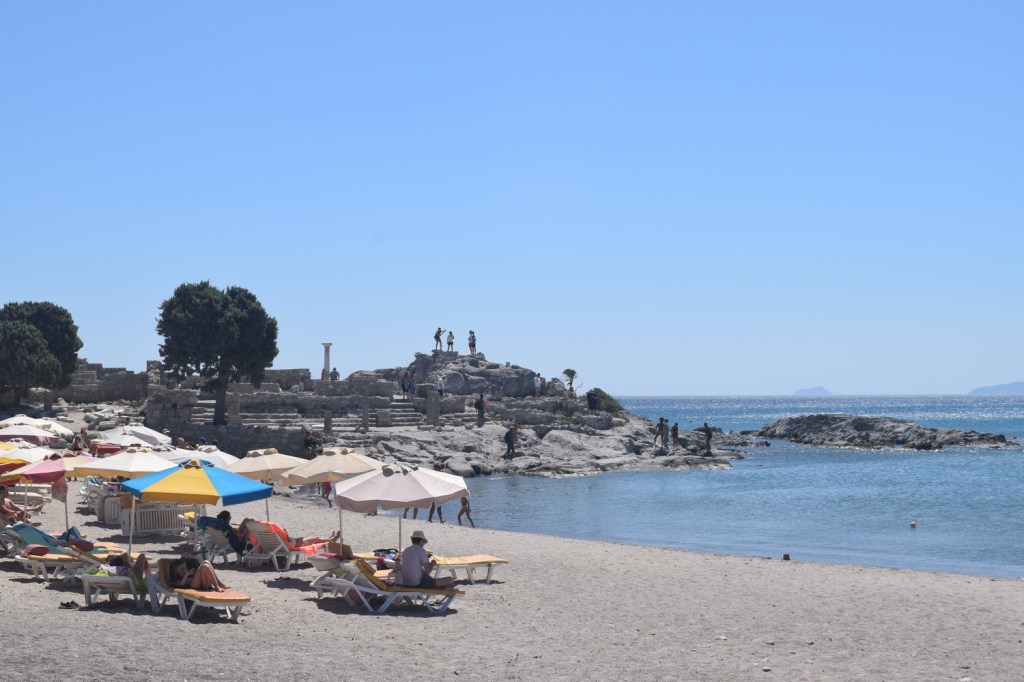 Just a little north was Agios Stefanos beach. This beach was busier because it included some ruins along with the views of the small island close by This beach had the unique backdrop of a large ruin. It had the remains of the Basilica of St. Stefanos built between 496 and 554 AD. The basilica survived one great earthquake of Byzantine times but not a later one, and fell into ruin. With calm, shallow waters and a resort close by, this section of the beach was popular.