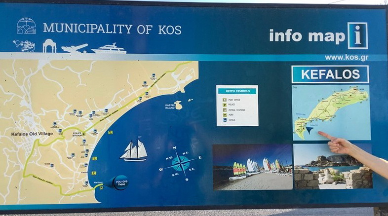 Nowadays the town of Kefalos is the gateway to beaches all along western coast of Kos. We didn’t need to travel far to enjoy them, as our hotel was a short walk from the main beach of the town (Paralia Kefalos). It was calm, clean and not too crowded, with the water being pleasant though not too warm. The water was shallow for quite a distance, and it almost looked like you could walk to the island. But swimming was required unless you rented one of the pedal-boats that were available. In the background was the Kastri, the remains of an old castle that used to guard against invaders and pirates. All that is left is a picturesque blue and white church in front.