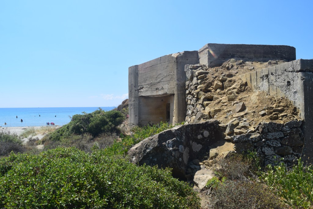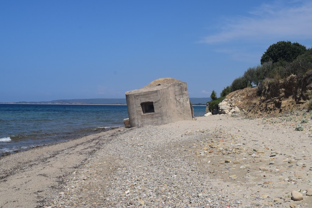 We eventually made it to Suvla Bay, which appeared relatively quiet in mid-summer. There was another destroyed bunker here; just a short distance away people were lying under parasols and enjoying the water.