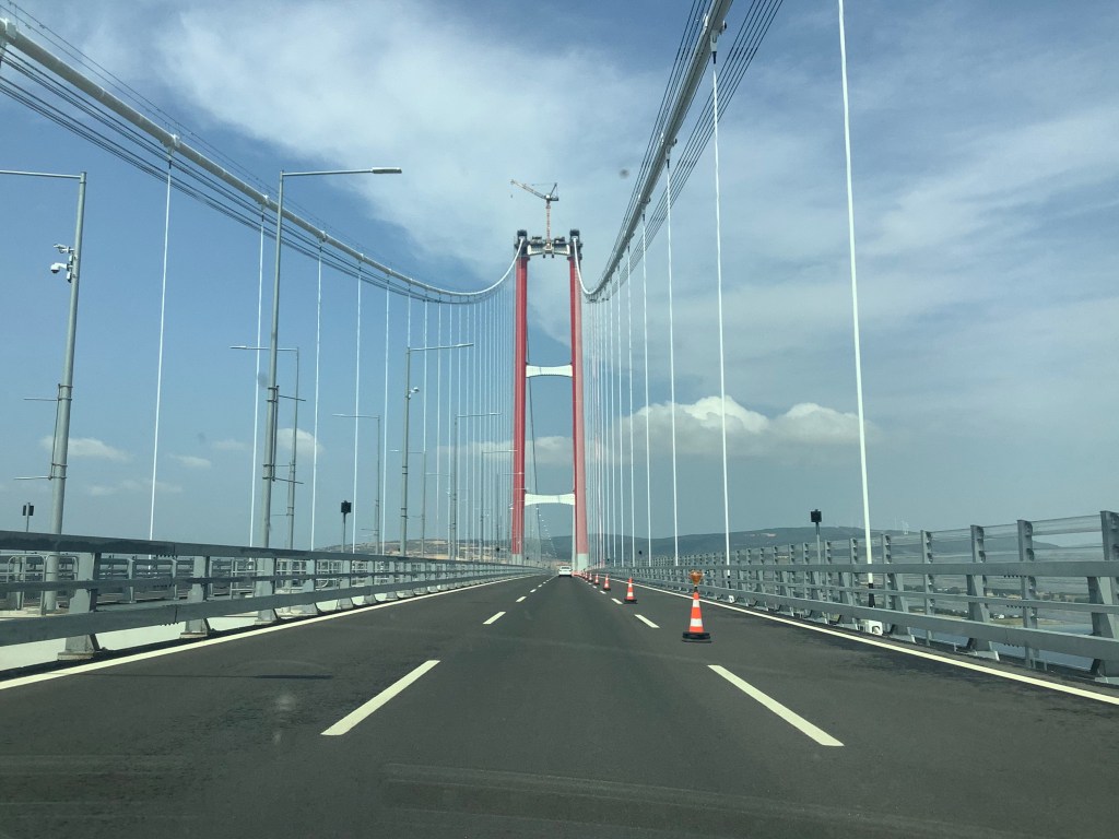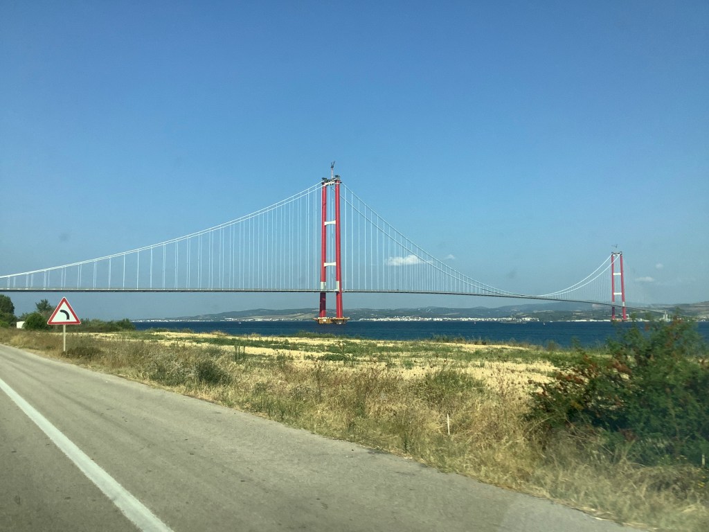 There are two ways of getting there, by ferry or across the new suspension bridge. We chose the bridge route for convenience and a unique experience. Completed in 2022, the 1915 Çanakkale Bridge is the longest suspension bridge in the world. It is located about 30 minutes from Canakkale using an easy highway route.