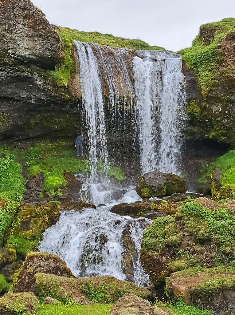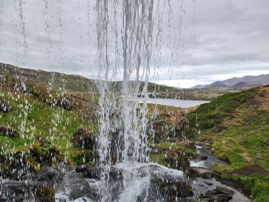 However, for our first stop we made a return to a place we visited two days earlier on the way up to the Snæfellsnes Peninsula. About 20 minutes outside Grundarfjörður we stopped at Selvallafoss, where there was a nice panorama viewpoint and lake. What we didn’t know was that were was a waterfall just a bit below our viewpoint. We hadn’t done any by that point in the trip and we didn’t make the connection that “~foss” in the place name meant waterfall. Once we learned it we decided to return to the waterfalls we never saw. We were glad we did because it was the only one I was able to get behind!