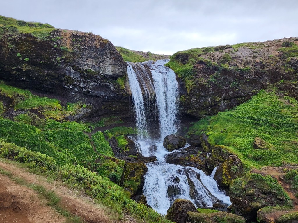 From there we headed back onto the ring road and began driving northeast. By now the weather started clouding over and it cooled down. Our next stop was Glanni Waterfall, located a short distance from the highway. It was also an easy walk from the parking lot and was a quick stop.