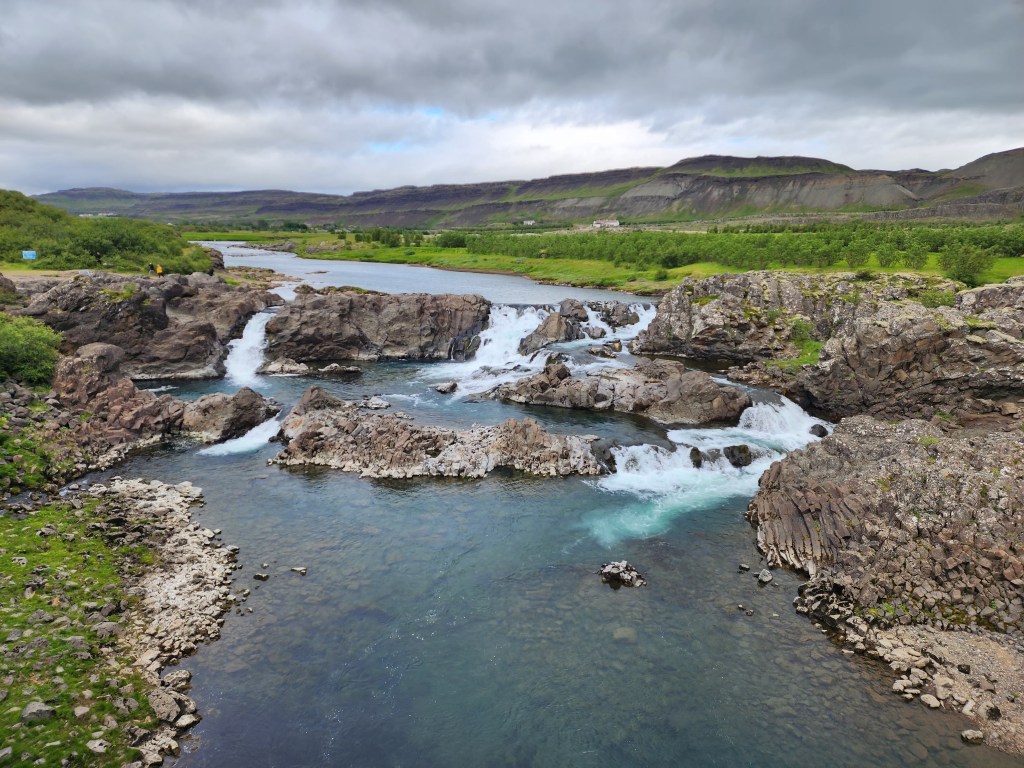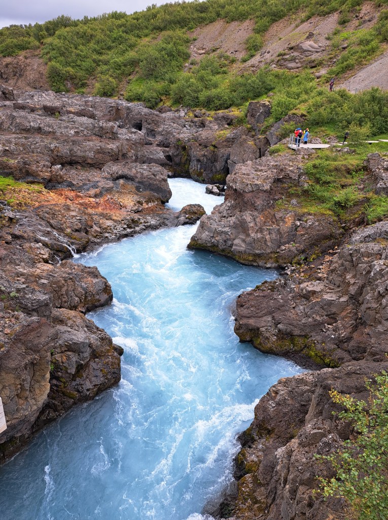 Further down highway 518 we drove to Barnafossar, a beautiful set of waterfalls featuring aquamarine water. It was a short walk from the parking area to a view of the wide falls set across the river.