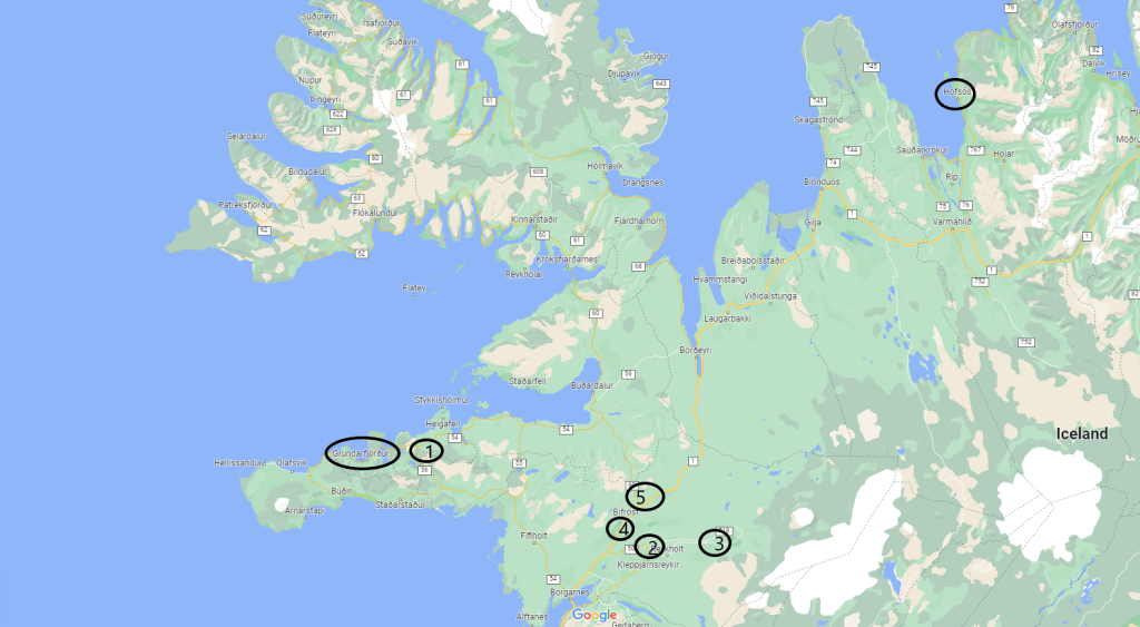 After a couple nights we started driving north-east from the Snæfellsnes Peninsula. It was at least 4.5 hours to our destination in Hofsós, so we had to choose the stops carefully along the way. In the end we decided on doing a group of sights clustered near our starting point as there were fewer points of interest to us further north along the ring road. The sights were a bit off the main road, but we knew we wouldn’t be able to see them otherwise.