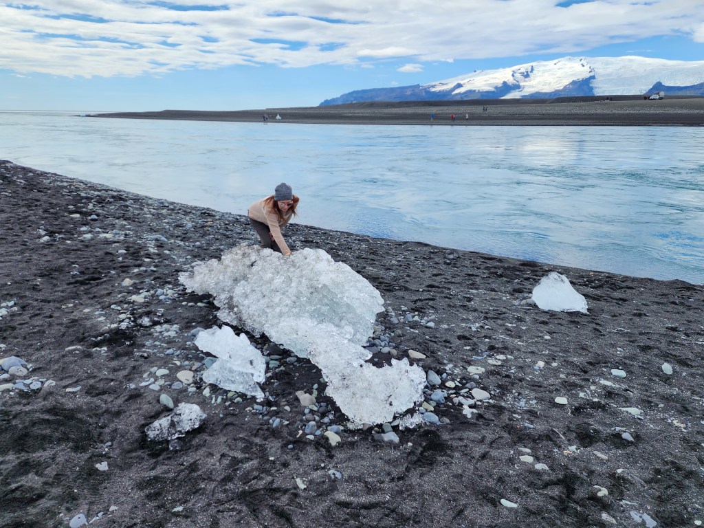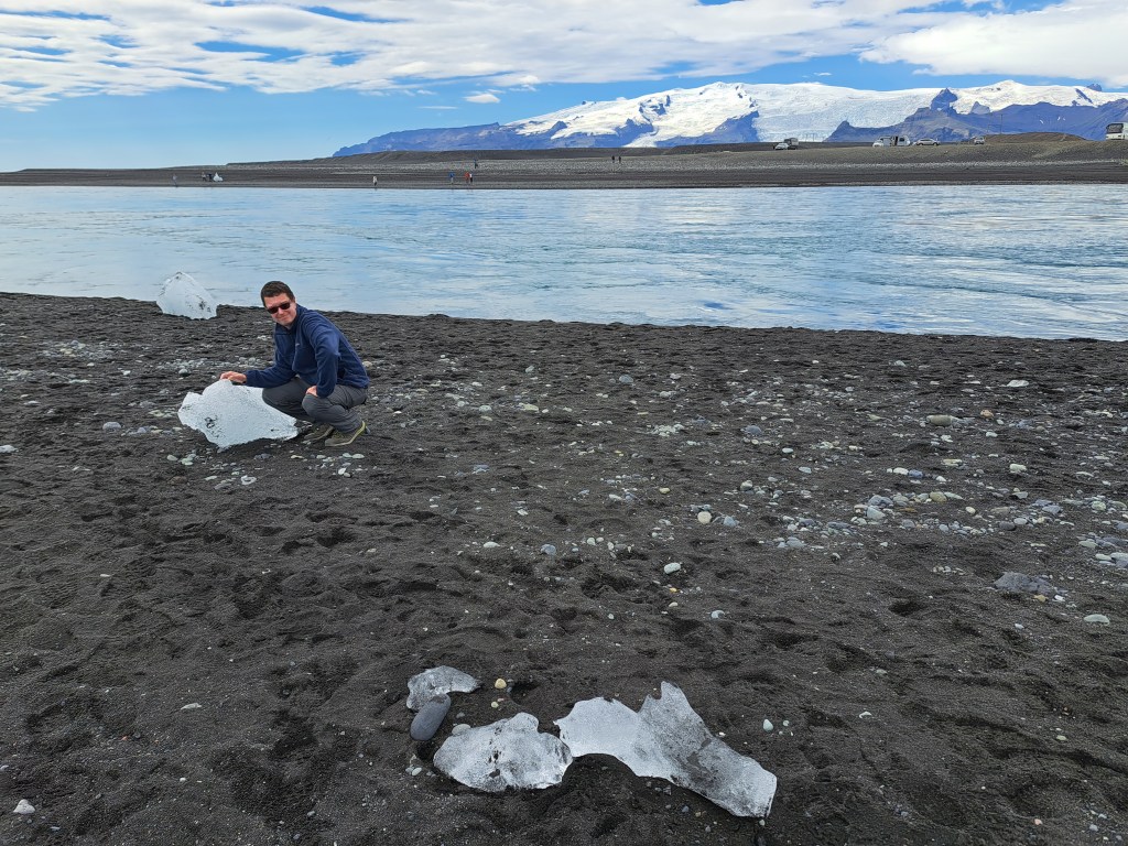 This area had one of the black sand beaches that Iceland is known for. In this case, the fragments of clear ice that floated down the channel and washed ashore provided a contrast with the sand underneath. It was called Diamond Beach. There were fewer fragments than in other times of the year but it was still a sight to see.