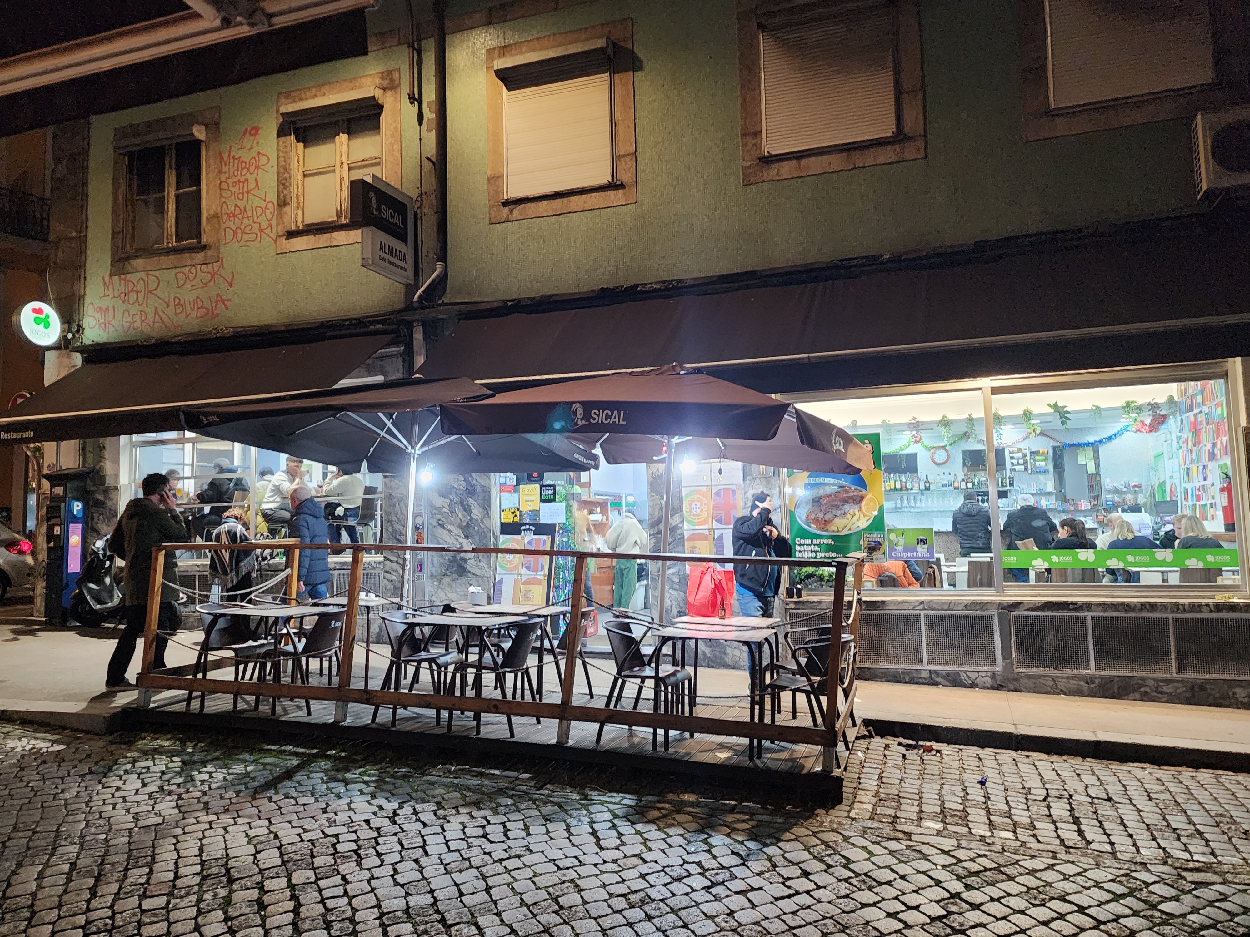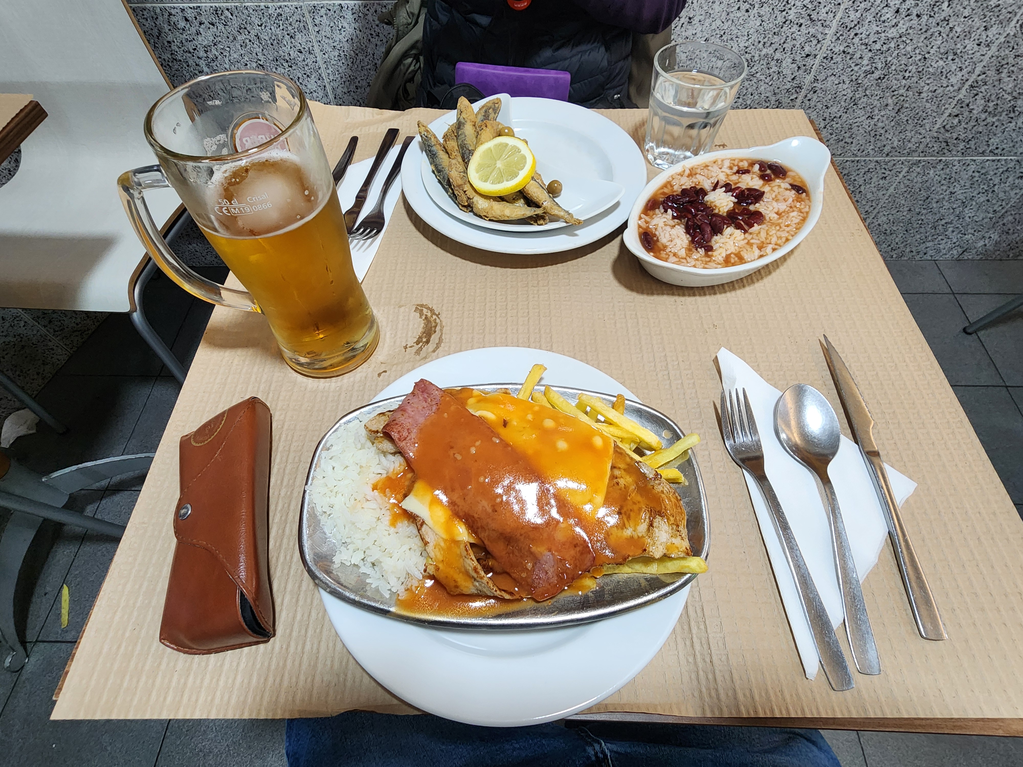 On the way back we had dinner at a local place in the downtown area. The food was simple but cheap and came with ample portions. K. had fried sardines and I had a version of the popular Francesinha with pork, ham, chips, rice and gravy on it.