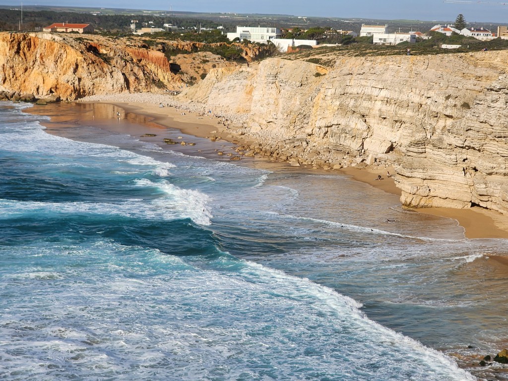 The town itself is small and simple, but the surrounding beaches draw surfers from far and wide. Dominated by high cliffs overlooking the Atlantic Ocean, the area is influenced by Mediterranean currents. The rocky features vary between 50 m (160 ft) and 200 m (660 ft) in height and the greenery consists mostly of low bushes and scrub.