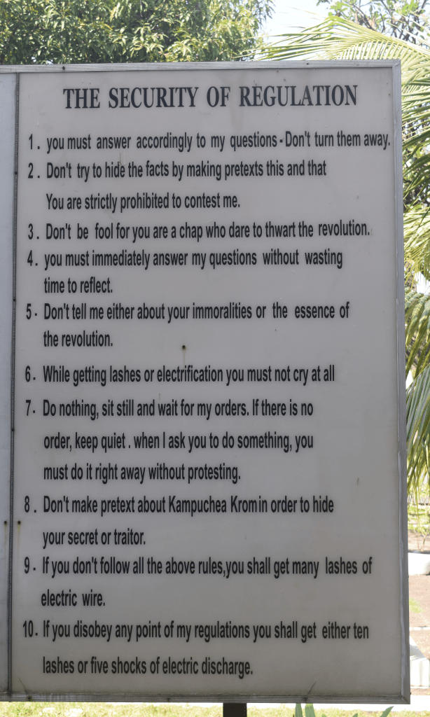 Life wasn’t so good for the guards either, as they were mostly teenagers. Many guards found the unit’s strict rules hard to obey. They were not allowed to talk to prisoners or learn their names. They were also expected to obey 30 regulations which barred them from such things as taking naps, sitting down or leaning against a wall while on duty. They had to walk, guard, and examine everything carefully. DUring the paranoid rule of the Khmer Rouge, guards who made serious mistakes were arrested, interrogated, jailed and put to death. Most of the people employed at S-21 were terrified of making mistakes and feared being tortured and killed