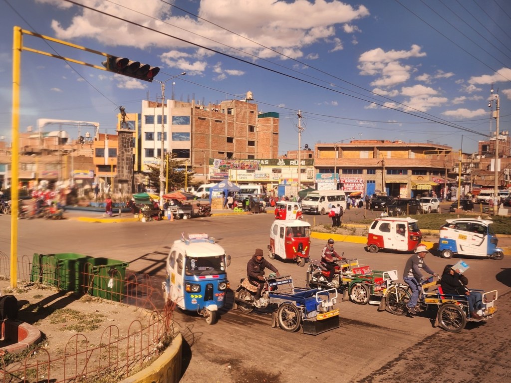 We passed a number of small towns along the way, but the bus didn’t stop until it reached Juliaca, about one hour from Puno. There was a lot of traffic in this city but we eventually left the bus terminal there and continued on to Puno.
