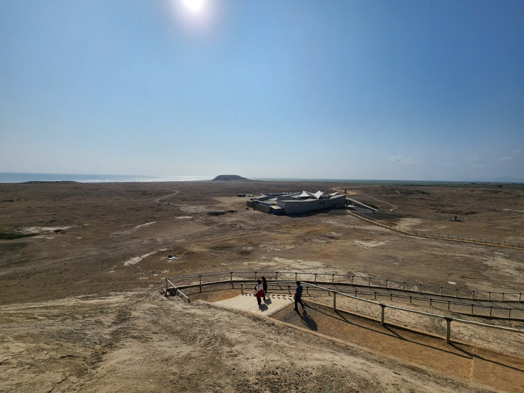 We went up to the upper platform, the location where the ceremonial sacrifices were held. From the top of the site the view over the flat lands stretched far into the distance. We could also see the Pacific ocean to one side.