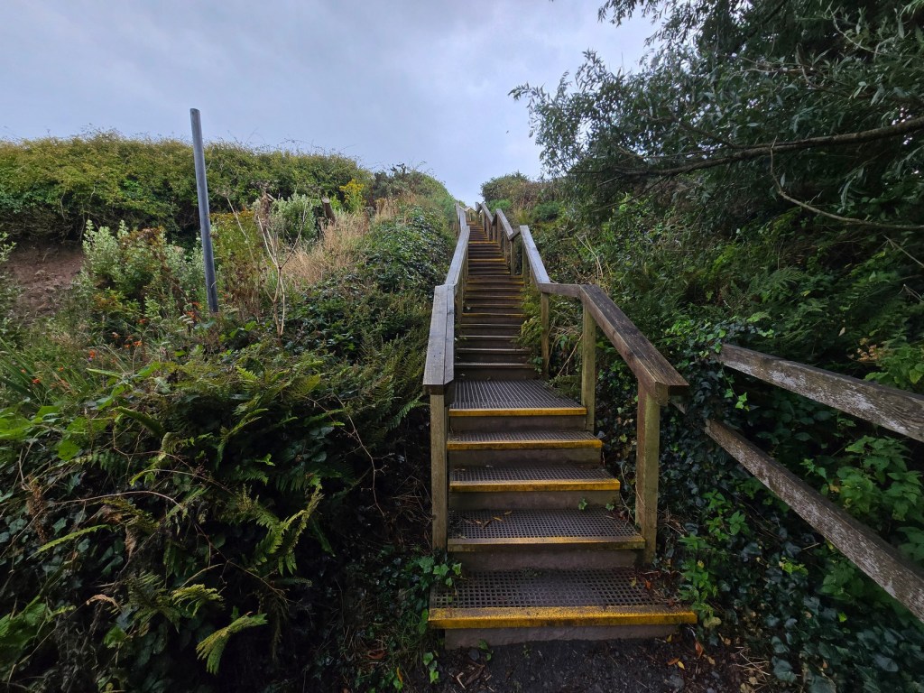 We found an official sign of Dunmore East Cliff Walk after parking our car in the free parking area near the cliff. There were a few houses around, but we quickly found the signs and wooden stairs leading us up the walking trail.