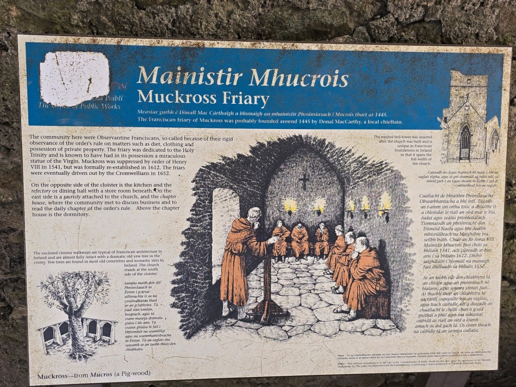 We spent about an hour at Muckross Abbey, not including the 40 minutes it took traversing the grounds both ways. It was an impressive place, highlighted by that huge yew in the courtyard, and we would recommend it to anyone visiting the Ring of Kerry. This section of the Ring of Kerry tends to get congested with cars, so patience is required if you are driving. It took us longer to get through this section of the ring than any section we did the next day when we drove the full Ring of Kerry.