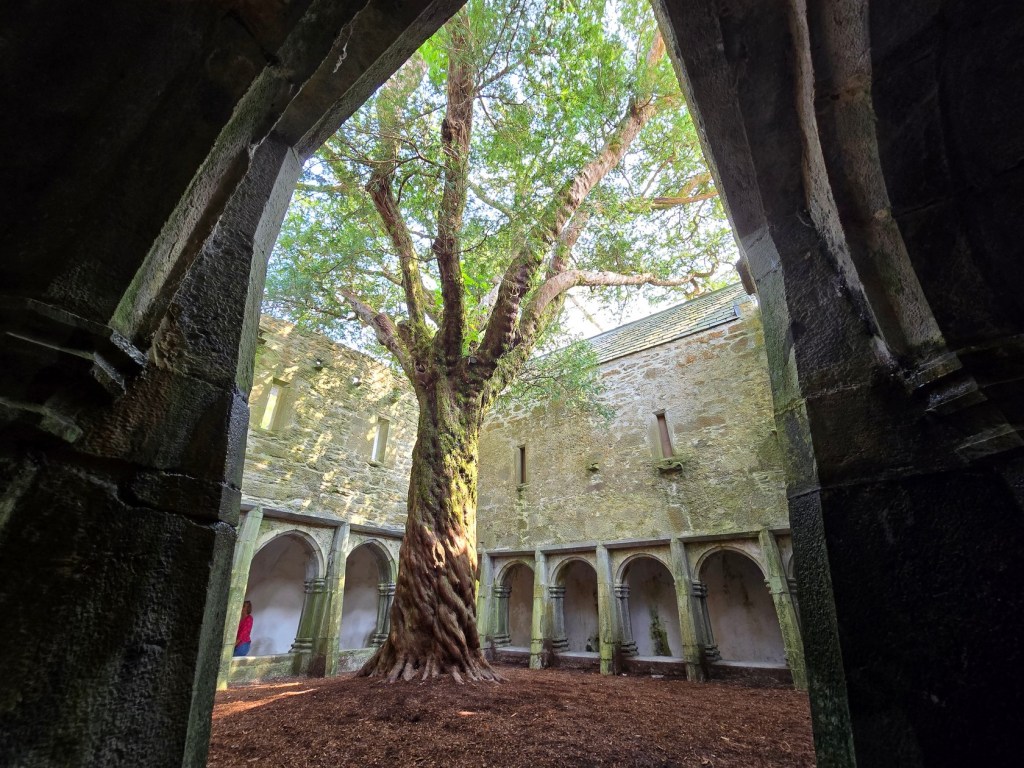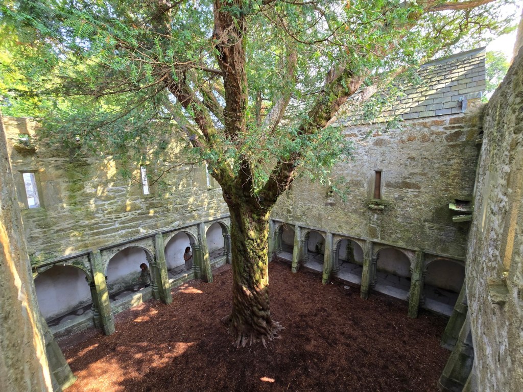 The cloister is the most striking part of the abbey. The yew tree growing at its centre is traditionally believed to be as old as the abbey itself and symbolizes eternity and renewal.