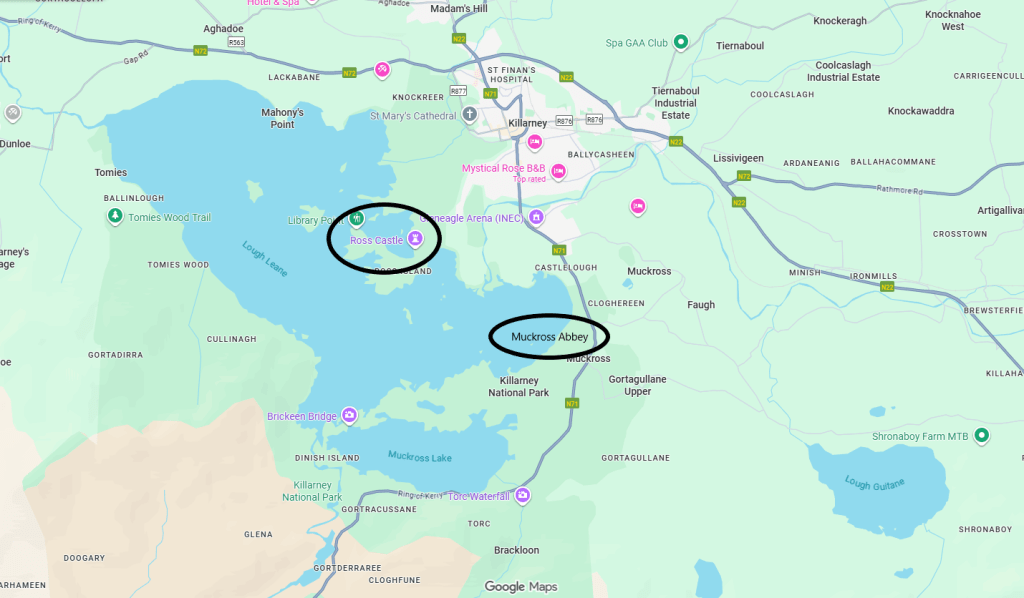 After leaving Kinsale we drove northwest towards Kenmare and the Ring of Kerry. With so much to see we decided to visit Ross Castle and Muckross Abbey on the way to our B&B just outside Kenmare. Then we would do the Ring of Kerry the next day.