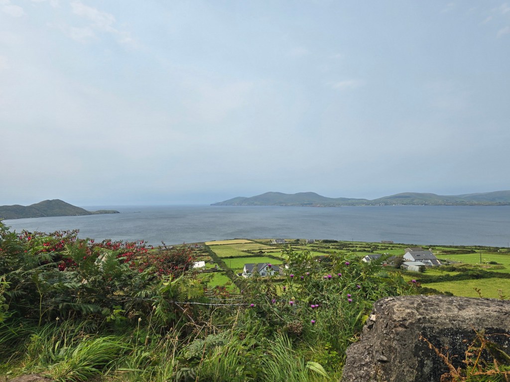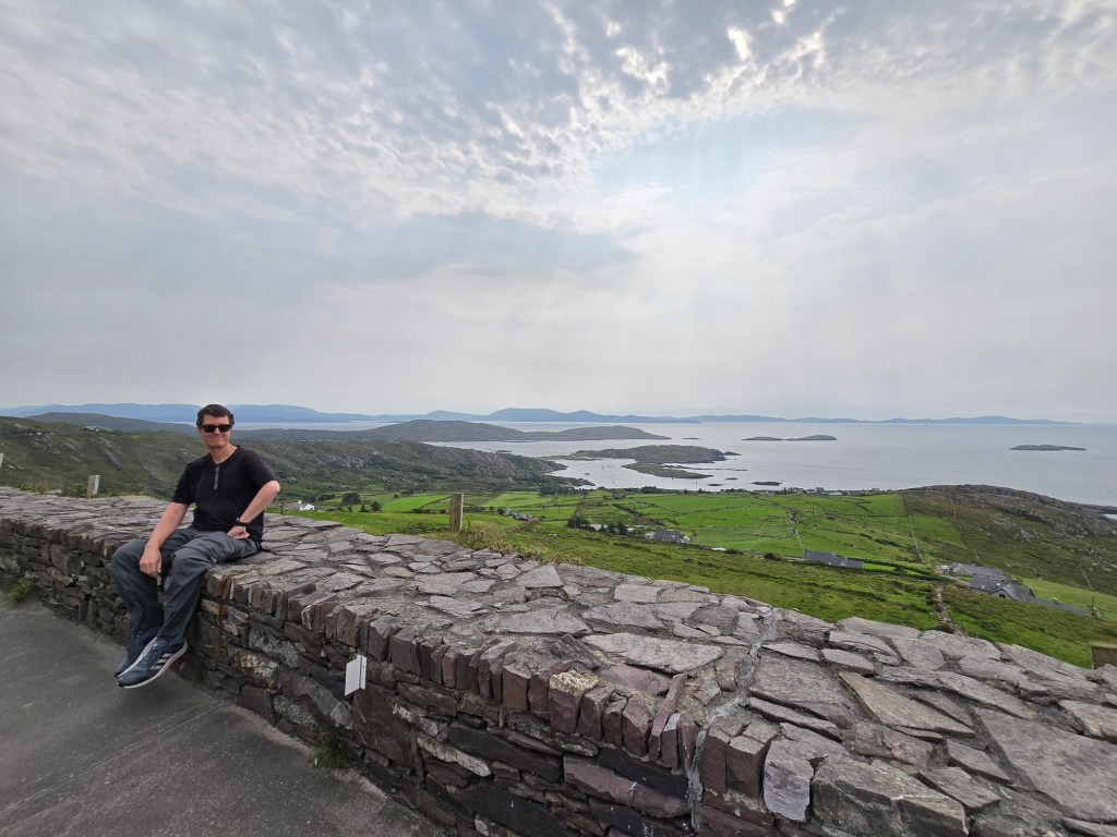 After passing through Sneem we saw more ocean and some stop-offs with excellent views of the pastures, villages and ocean. There were a number of stop-offs along the way, with some having a full parking lot and others having space for just single line of about 4 or 5 vehicles.
