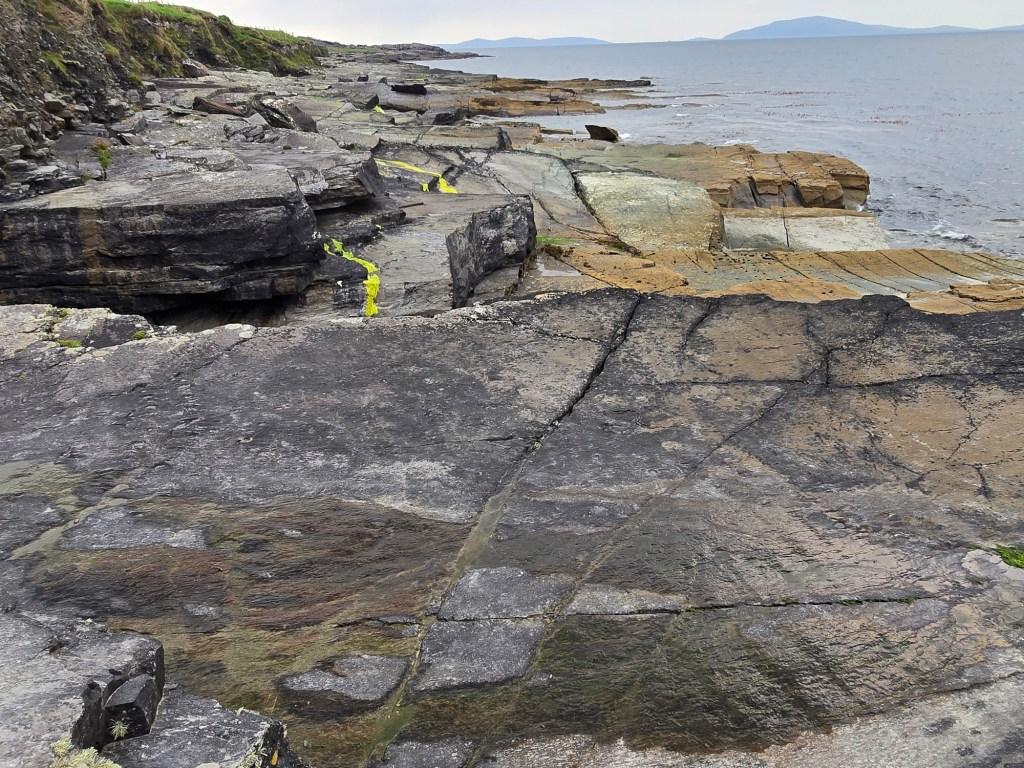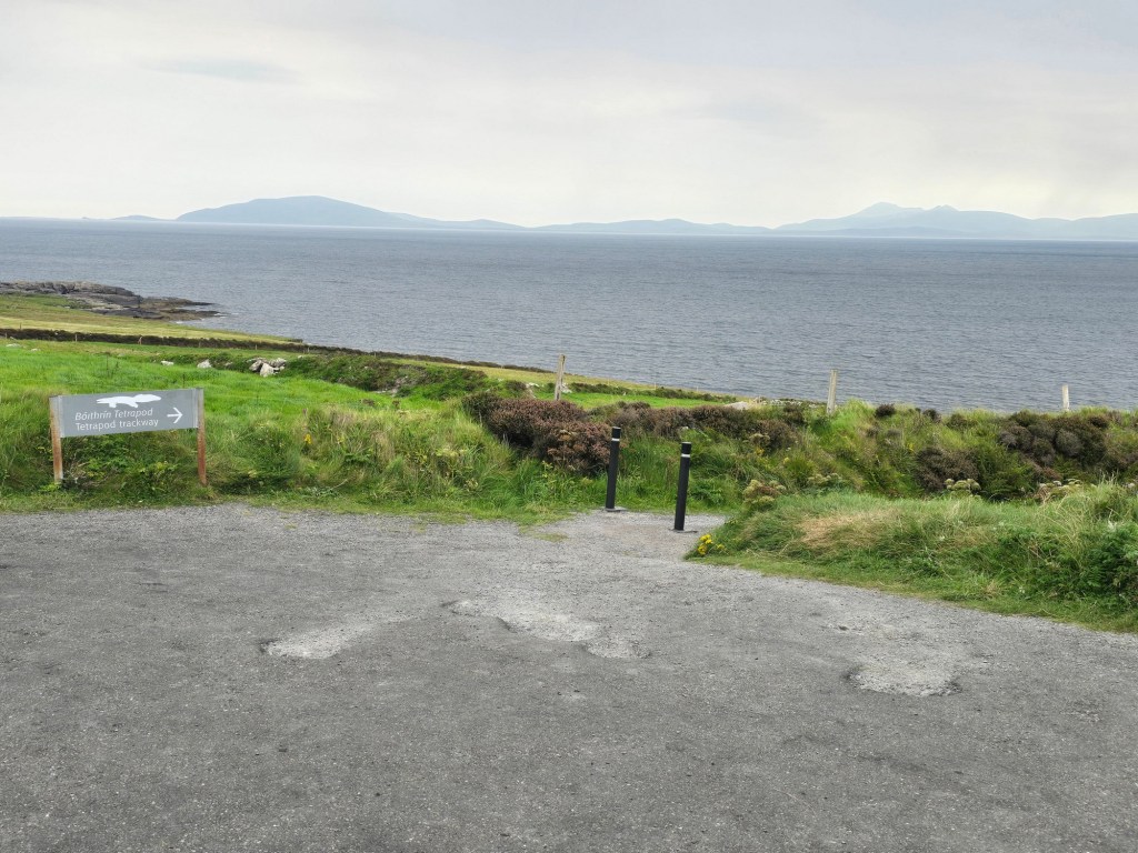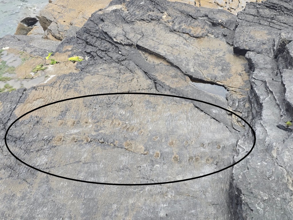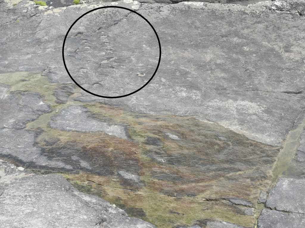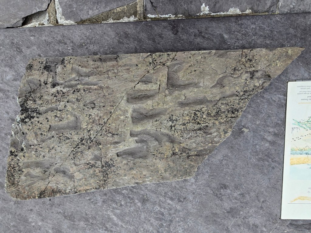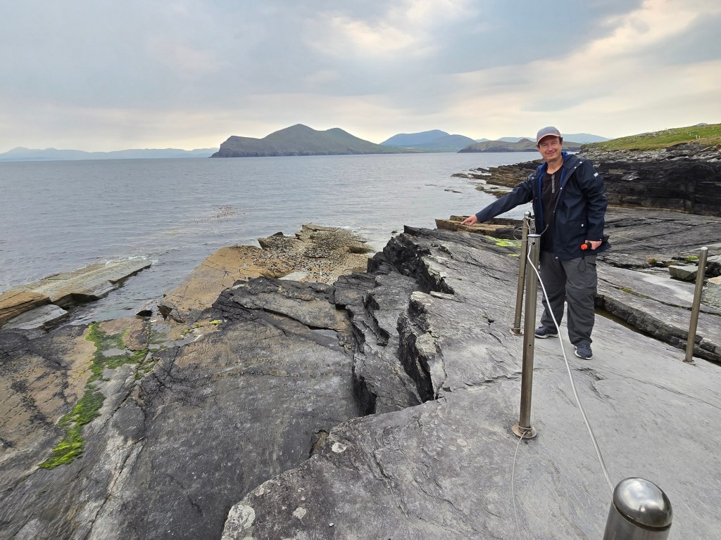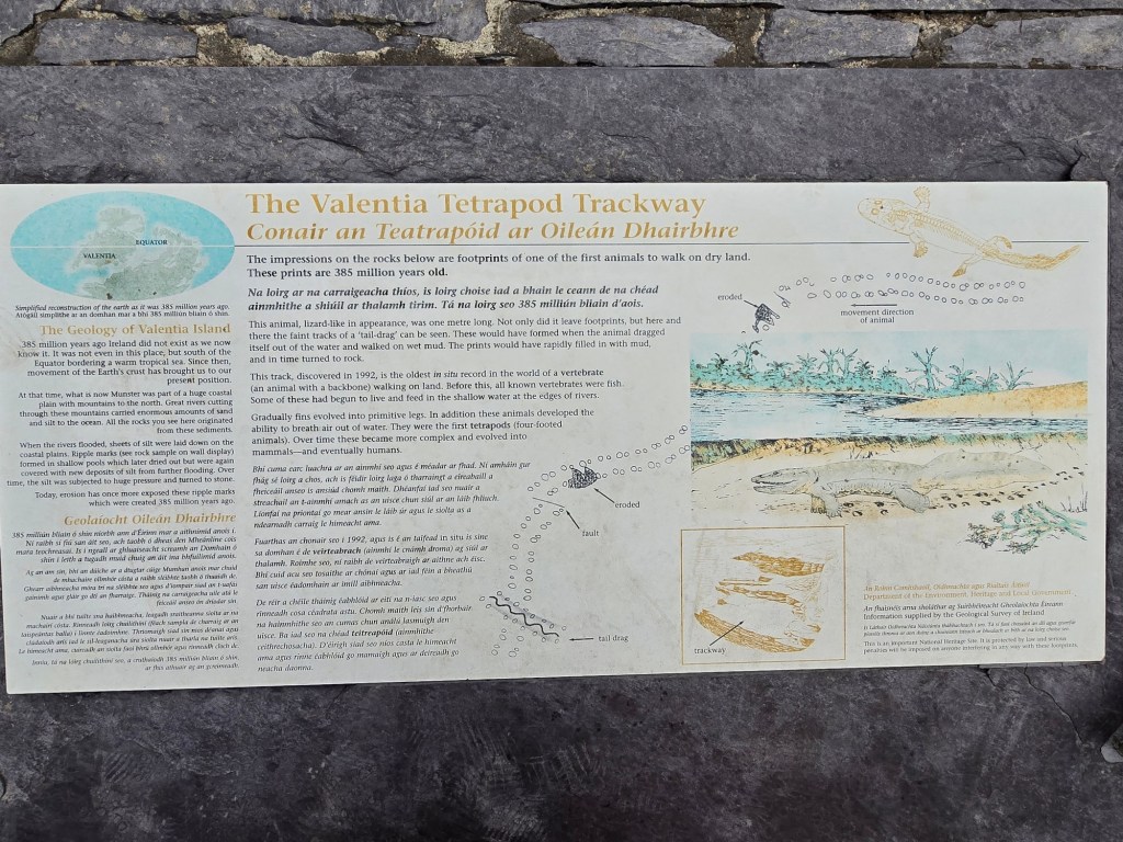 But we were on Valentia Island for something completely different–ancient fossils! In 1993 an undergraduate geology student discovered a tetrapod track on the northeast part of Valentia Island. Tetrapod tracks are the footprints of an animal believed to have been created about 385 million years ago. The Valentia Island trackway is significant because it provides some of the oldest evidence of one of the first water-dwelling creatures which crawled out of the water and made the important evolutionary step toward living on land.