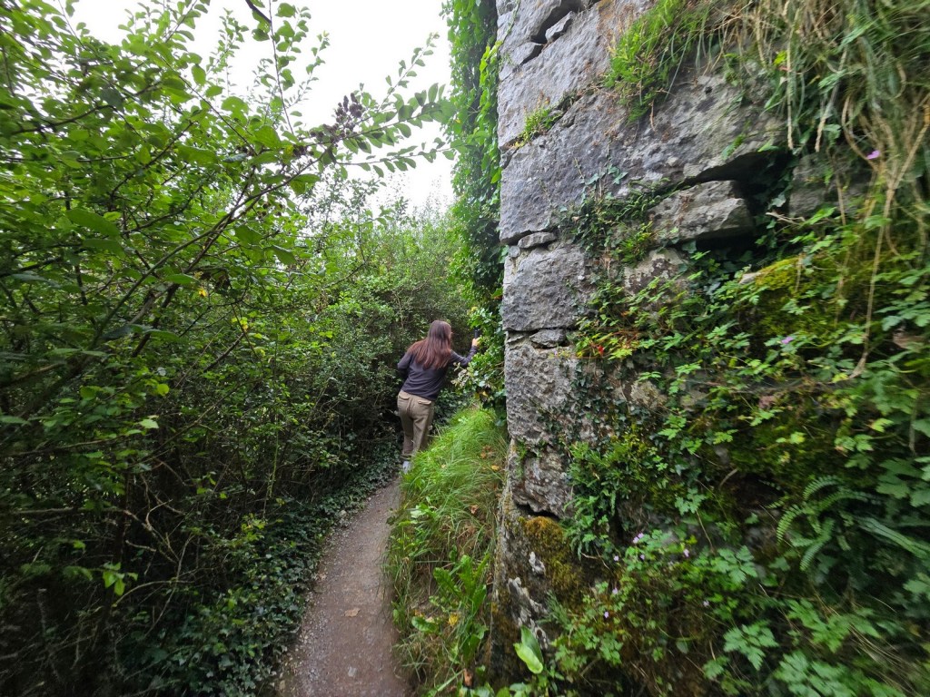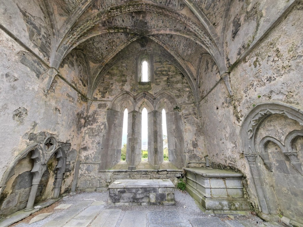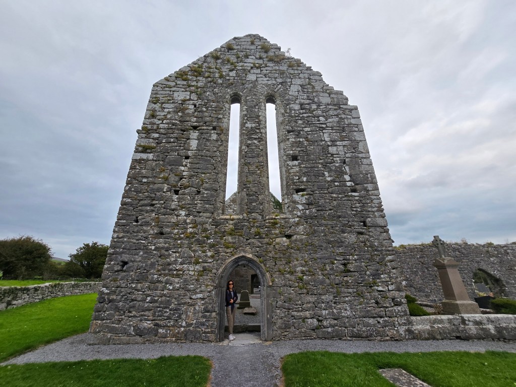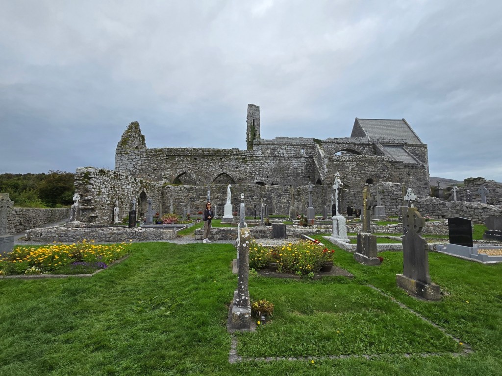As we made our way through the Burren we found the first stop: Corcomroe Abbey. The abbey is surrounded by the stark limestone hills of the Burren, but sits in a fertile green hollow. The mostly intact walls of the grey abbey contrast with the greenery around it, making it a very atmospheric set of monastic ruins.