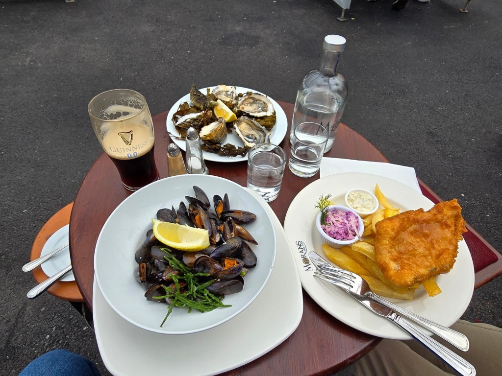 A short distance north of Dunguaire Castle is Moran’s Oyster Cottage, where we stopped for lunch. Also located on the shores of Galway Bay, we went there because it had a reputation for excellent oysters. Along with my first pint of alcohol-free Guinness (quite good), the oysters were excellent. There were large and full of flavour, and deserved their positive reputation. The fish and chips were also good. However, the mussels were very small and a number of them remained closed and couldn’t be eaten, making them a disappointment. But we highly recommend the oysters!